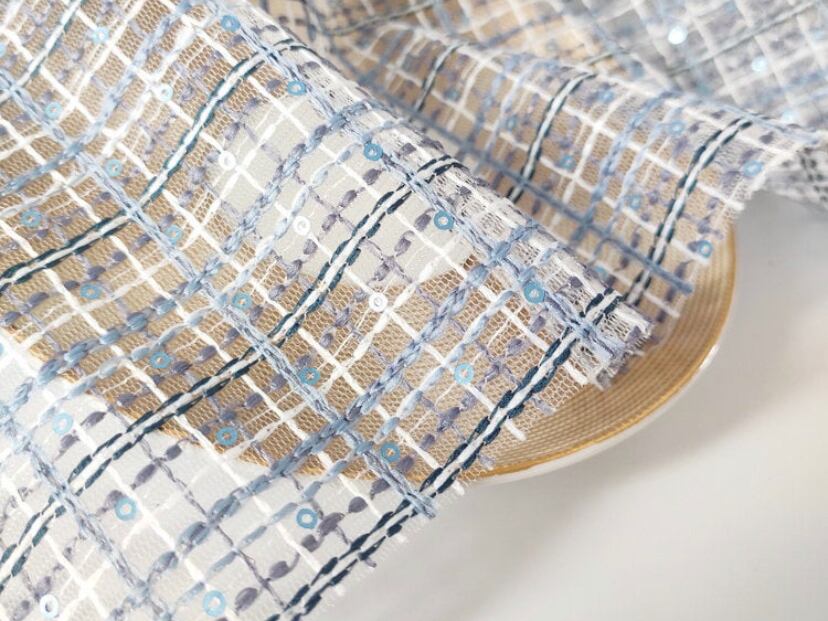 チュールにツイード糸とスパンコールで刺繍が施されている珍しいデザインの生地です。