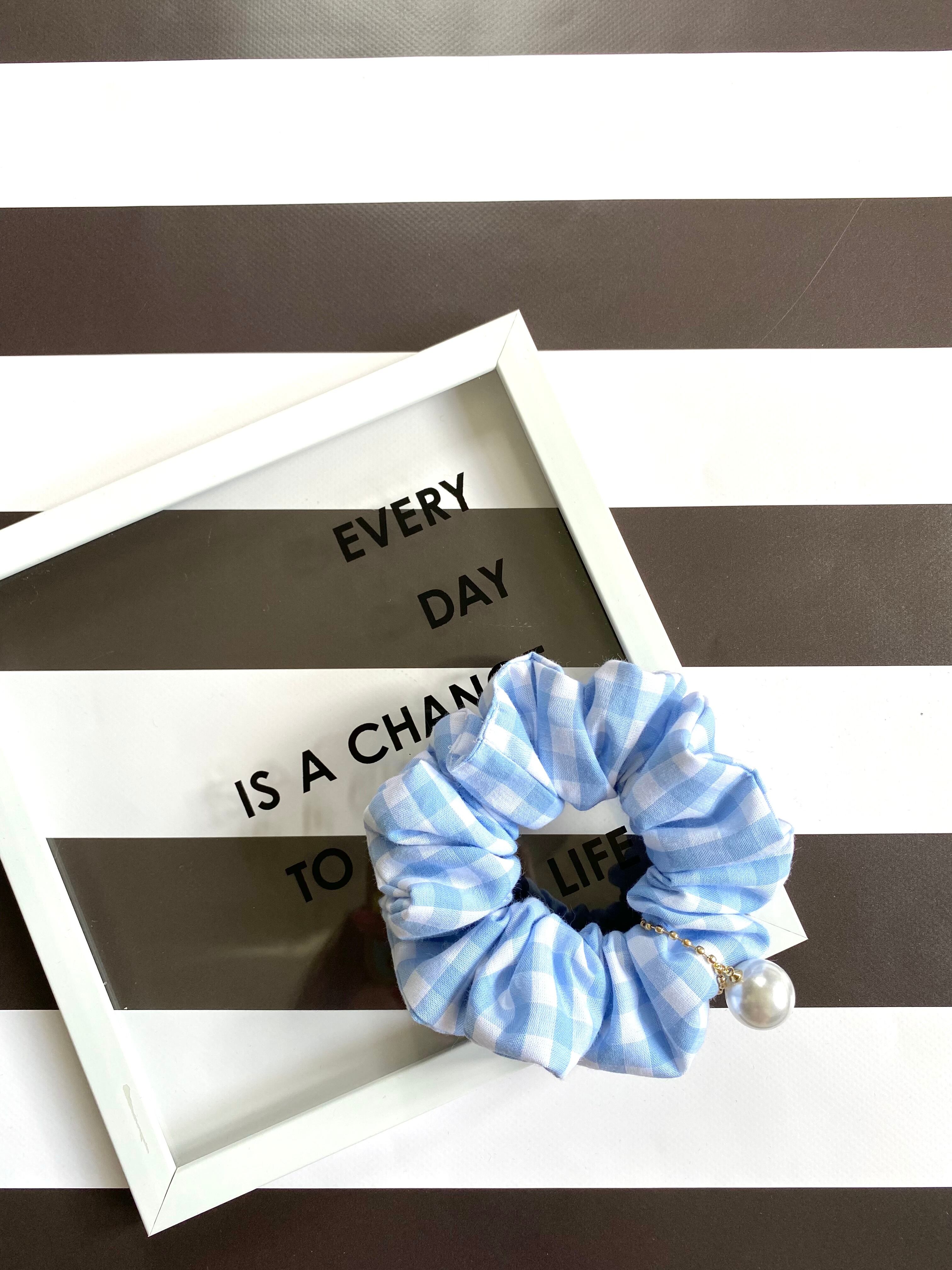 ギンガムチェック 大粒パール付 シュシュ(ベビーブルー)