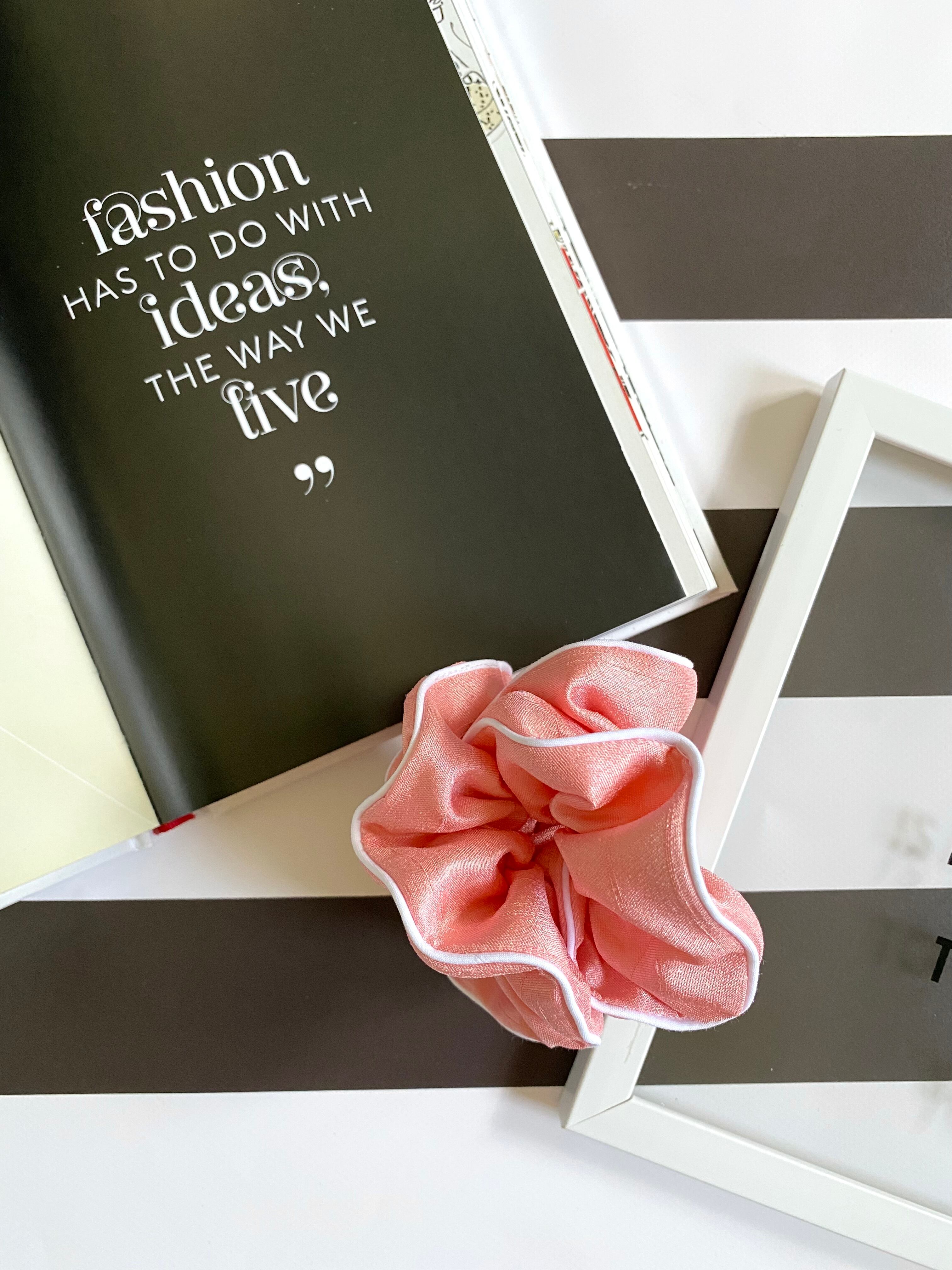 シャンタン生地の上品で華やかな光沢と、他のシュシュよりも多目に取ったフリルがとても可愛く、縁のパイピングがアクセントになったオシャレで眺めていたくなるシュシュです。