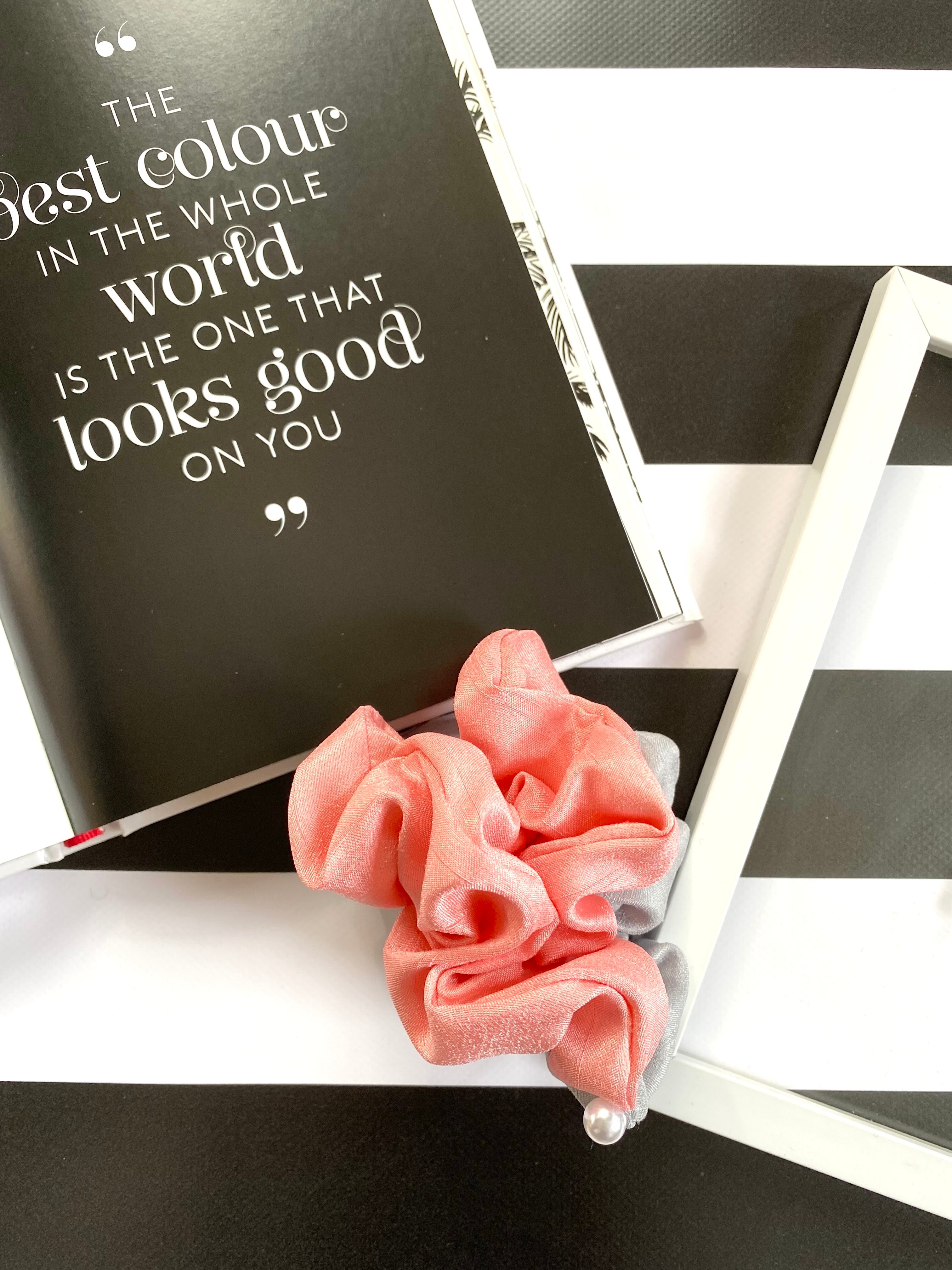シャンタン生地の上品で華やかな光沢と、他のシュシュよりも多目に取ったフリルがとても可愛いシュシュです。グレーとの組み合わせで落ち着いた雰囲気に仕上げました。さりげないパールもアクセントになります。