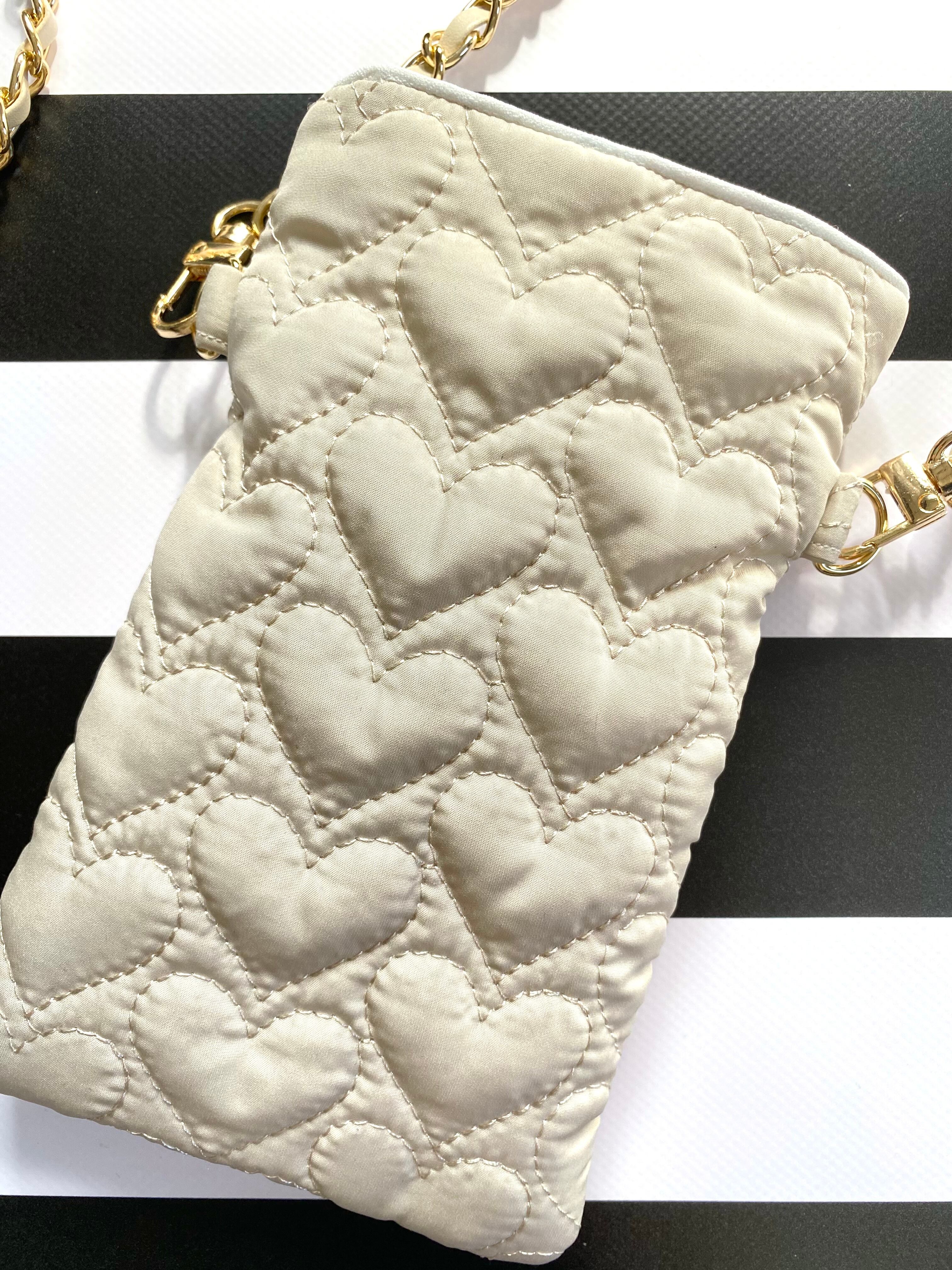 ハート柄のステッチがとても可愛いキルト生地のスマホショルダーです。旬のキルト生地×ハートでオシャレ度もアップです。