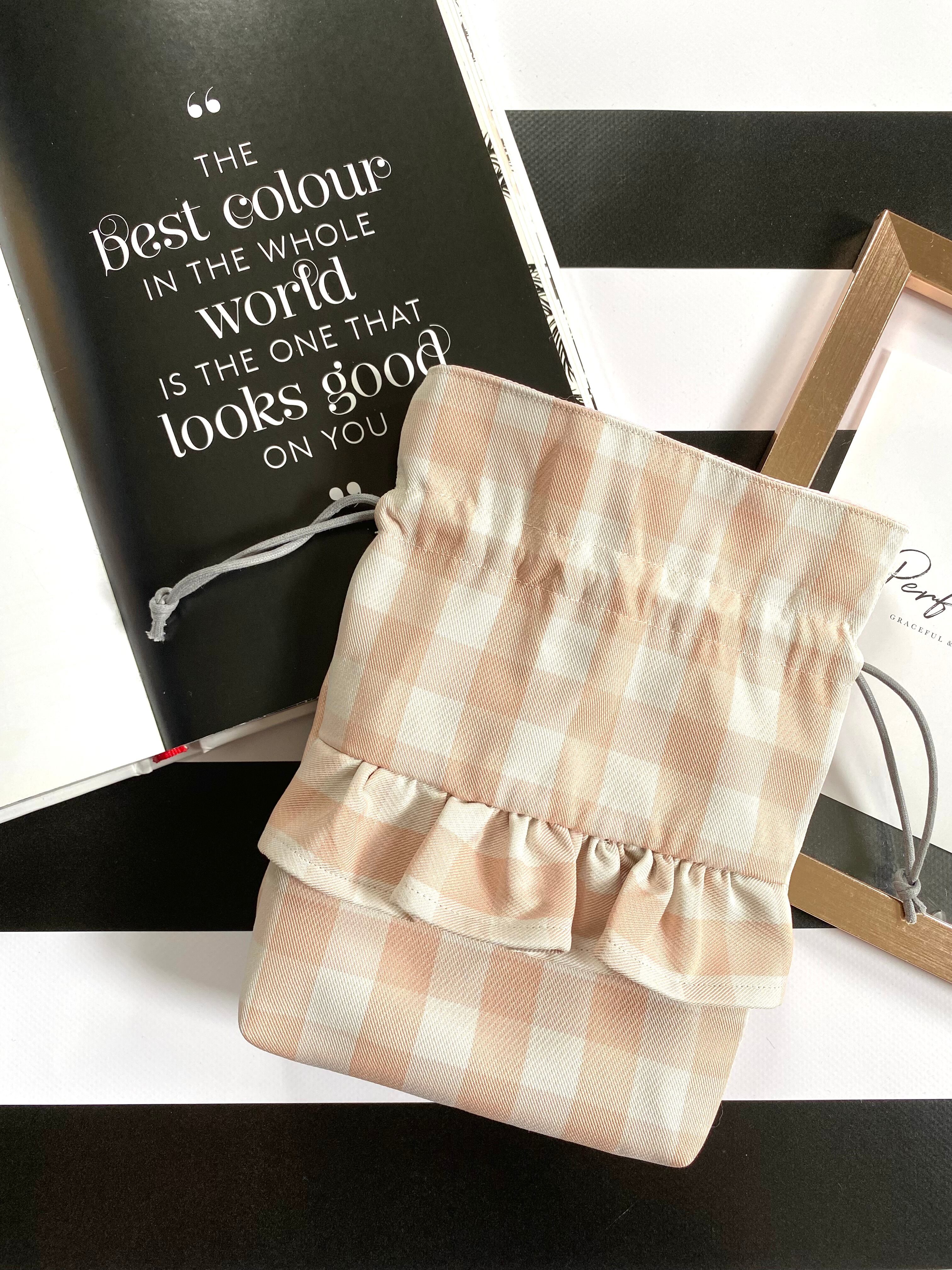 大柄のギンガムチェックが可愛いジャガード生地の巾着です。バッグの中にスッキリ収まるように少しコンパクトなサイズに仕上げました。