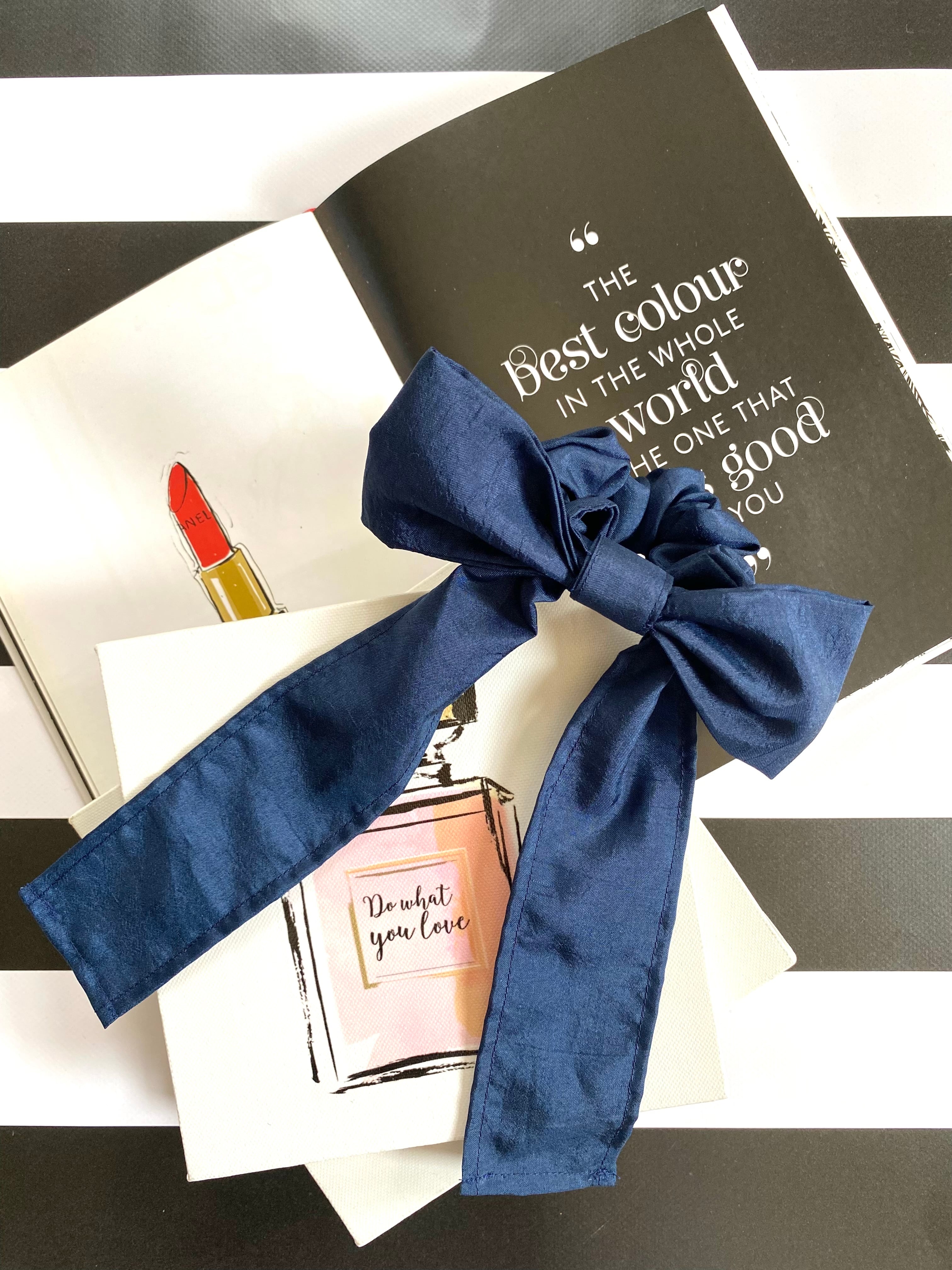 ロングリボンがポイントになったオシャレなシュシュです。シンプルで上品な生地を使用しているので、幅広い年齢層の方に挑戦していただきたい旬なスタイルのシュシュです。