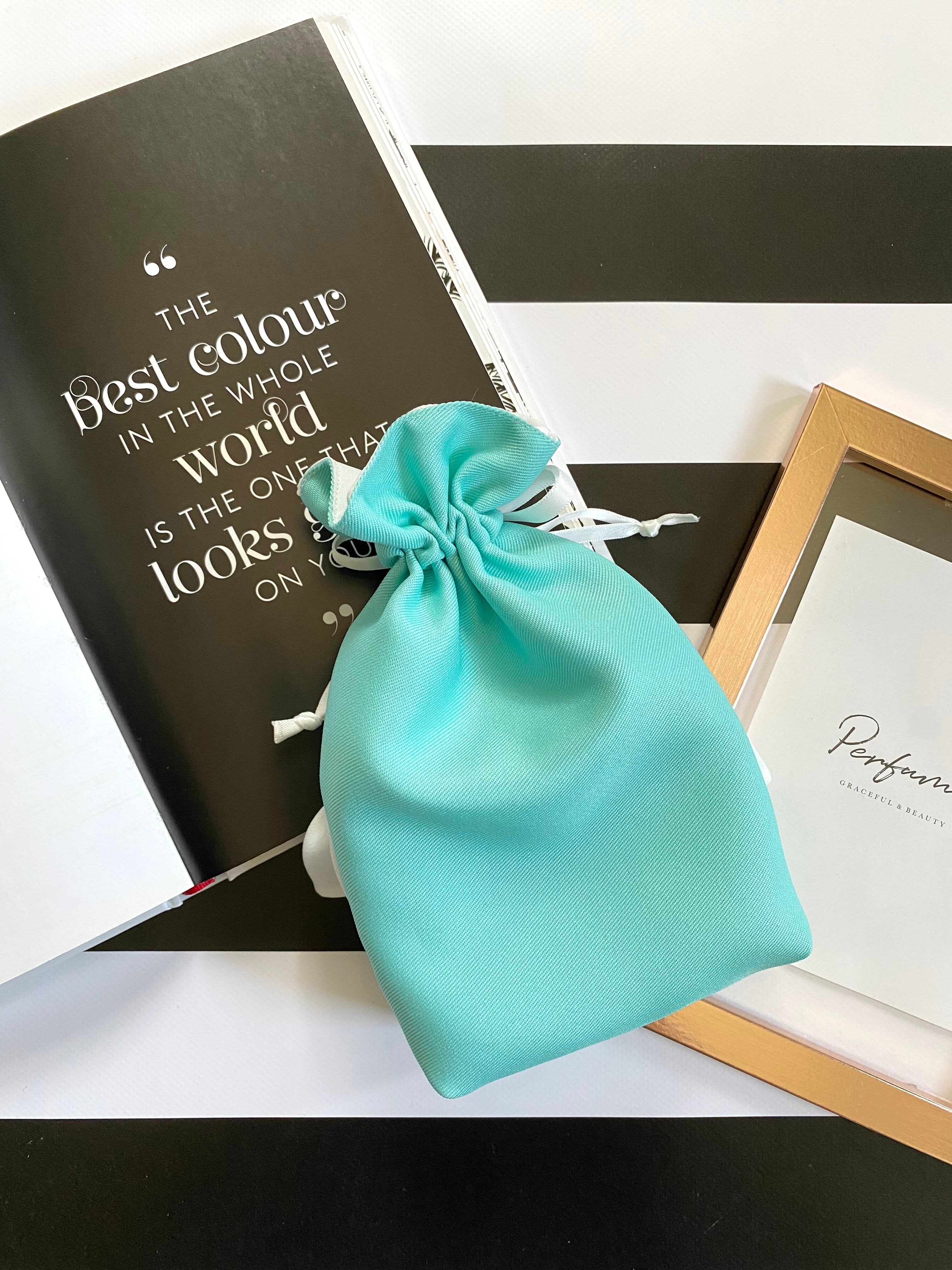 大人気ティファニーブルーシュシュと共布で作製しました。ホワイトのフリルがとても可愛い巾着ポーチです。